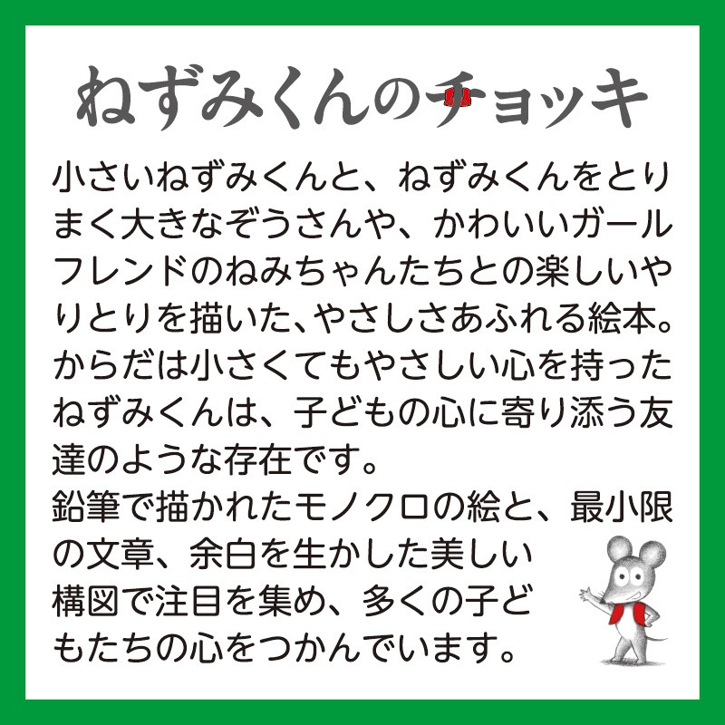 小さいねずみくんと、ねずみくんをとりまく大きなぞうさんや、かわいいガールフレンドのねみちゃんとの楽しいやりとりを描いた、やさしさあふれる絵本。からだは小さくても優しい心を持ったねずみくんは、子どもの心に寄り添う友達のような存在です。