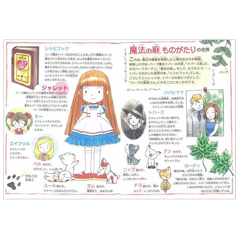 「ハーブの薬屋さん」ジャレットのものがたり。 ジャレットは、ふつうの人間の女の子。ある日、ひょんなことからハーブ魔女・トパーズの遺産を相続することになります。ジャレットが相続したものは、「トパーズ荘」(トパーズの屋敷)、「魔法の庭」(屋敷のまえに広がるハーブガーデン)、「レシピブック」(トパーズが書き残したハーブ薬のレシピ)の3つ。トパーズとちがって魔法をつかうことのできないジャレットは、心をこめてハーブを育て、みんなの役に立とうと決心しました。こうして、さまざまな人や動物たちと出会い、ハーブのお薬を作って、お客さまを元気にしていく、一人の少女の成長の物語です。