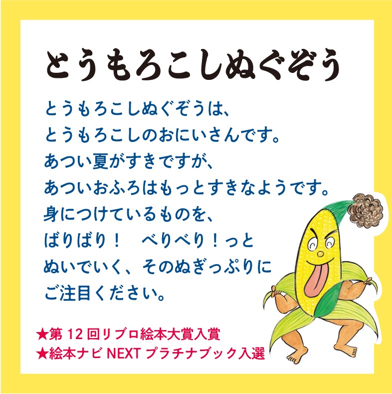 筋肉ムキムキのとうもろこしぬぐぞうが、葉っぱの服や髪の毛を勢いよくバリバリ、ぶちっと脱いでいく人気絵本。脱いだあとは、気持ちよいお風呂で一息!